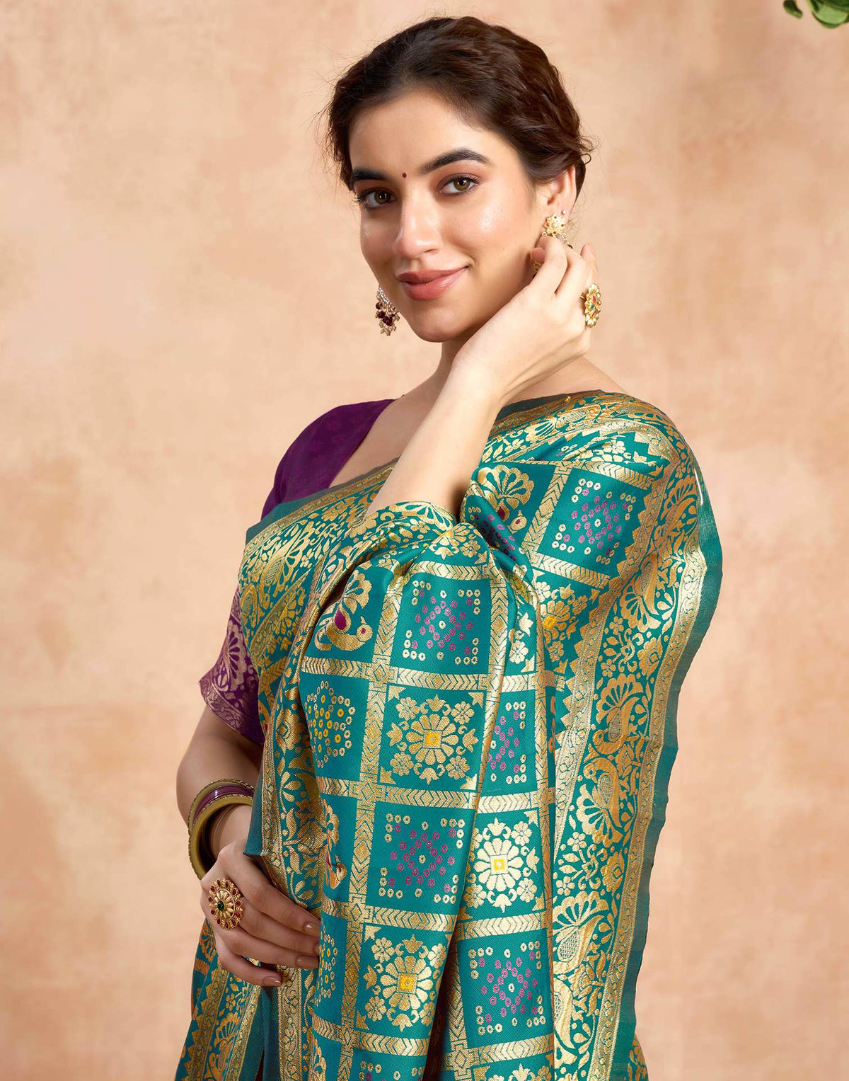 This dazzling saree showcases a peacock teal body woven with an intricate diamond-shaped grid. The beautiful pallu provides a spectacular contrast in fuchsia pink/purple, densely packed with heavy traditional brocade work in multicolored zari, offering a vibrant and majestic look.