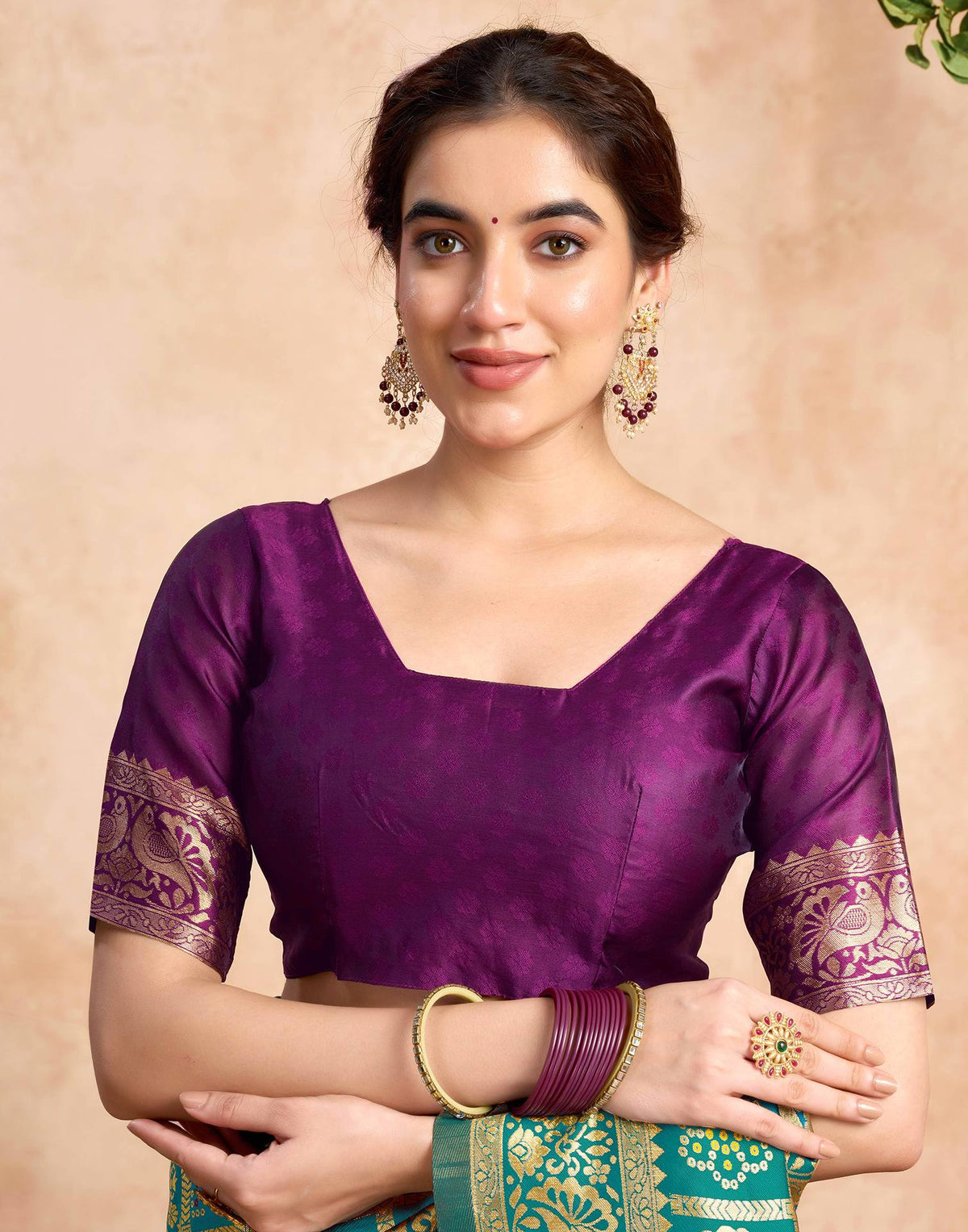 Saree Color Vibrant Peacock Teal body with a colorful Fuchsia Pink/Purple and Gold contrast pallu.
