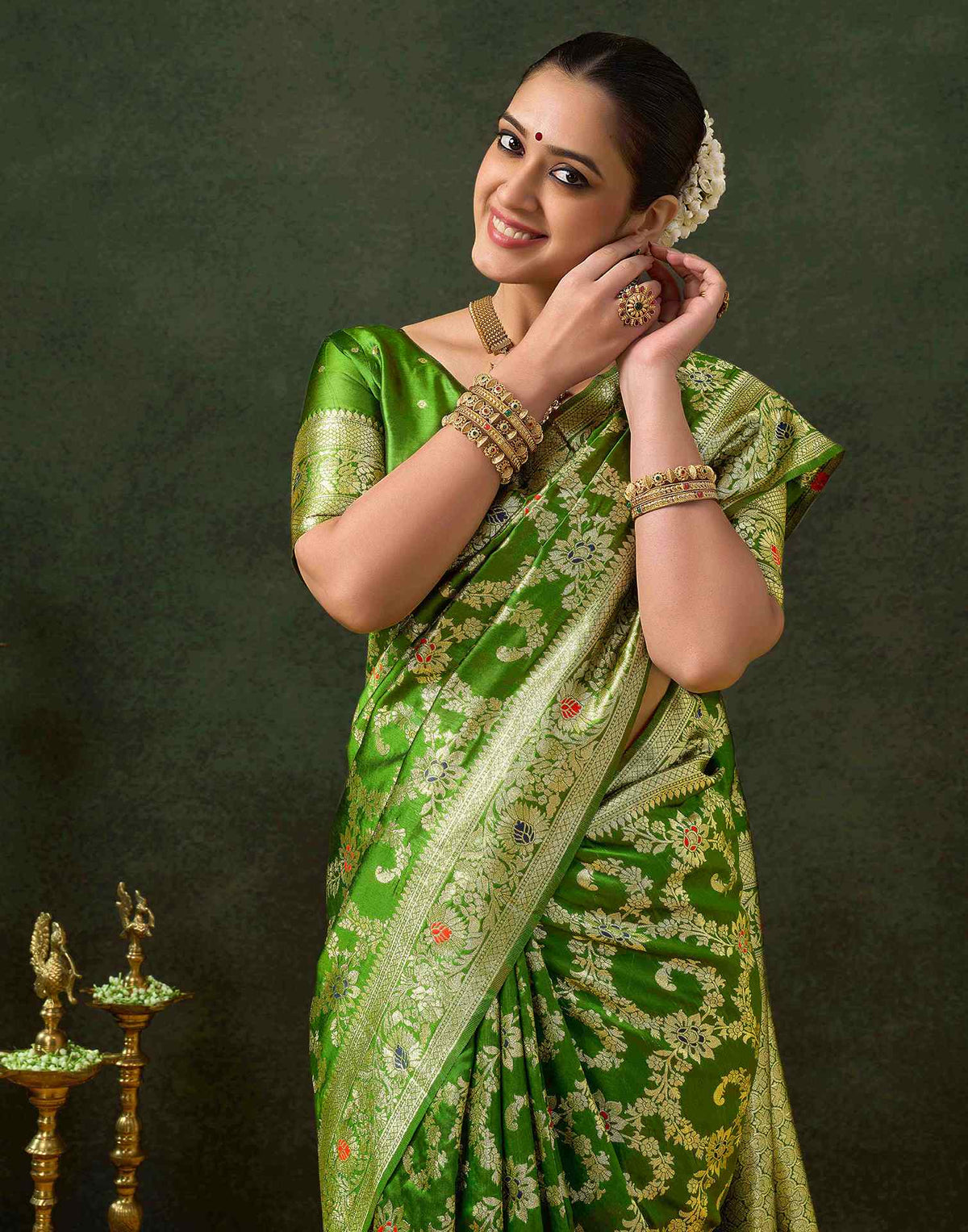 A vibrant and auspicious lime green saree, richly woven with golden zari florals throughout the body. The contrasting pallu and border feature dense, traditional brocade patterns, ensuring a dazzling and festive presence.